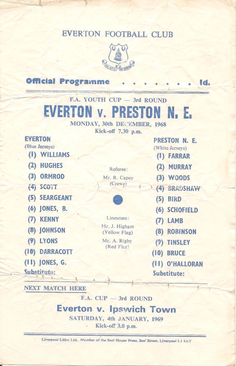 | 30 Dec 68 | Home - Goodison Park | Preston North End | 3rd Round | 4-0 | Jones G 2, Kenny W, Lyons M | Unknown |