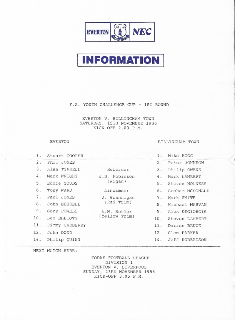 | 15 Nov 86 | Home - Goodison Park | Billingham Town | 1st Round | 5-0 | Powell G 3, Dodd J, Carberry J | 247 |