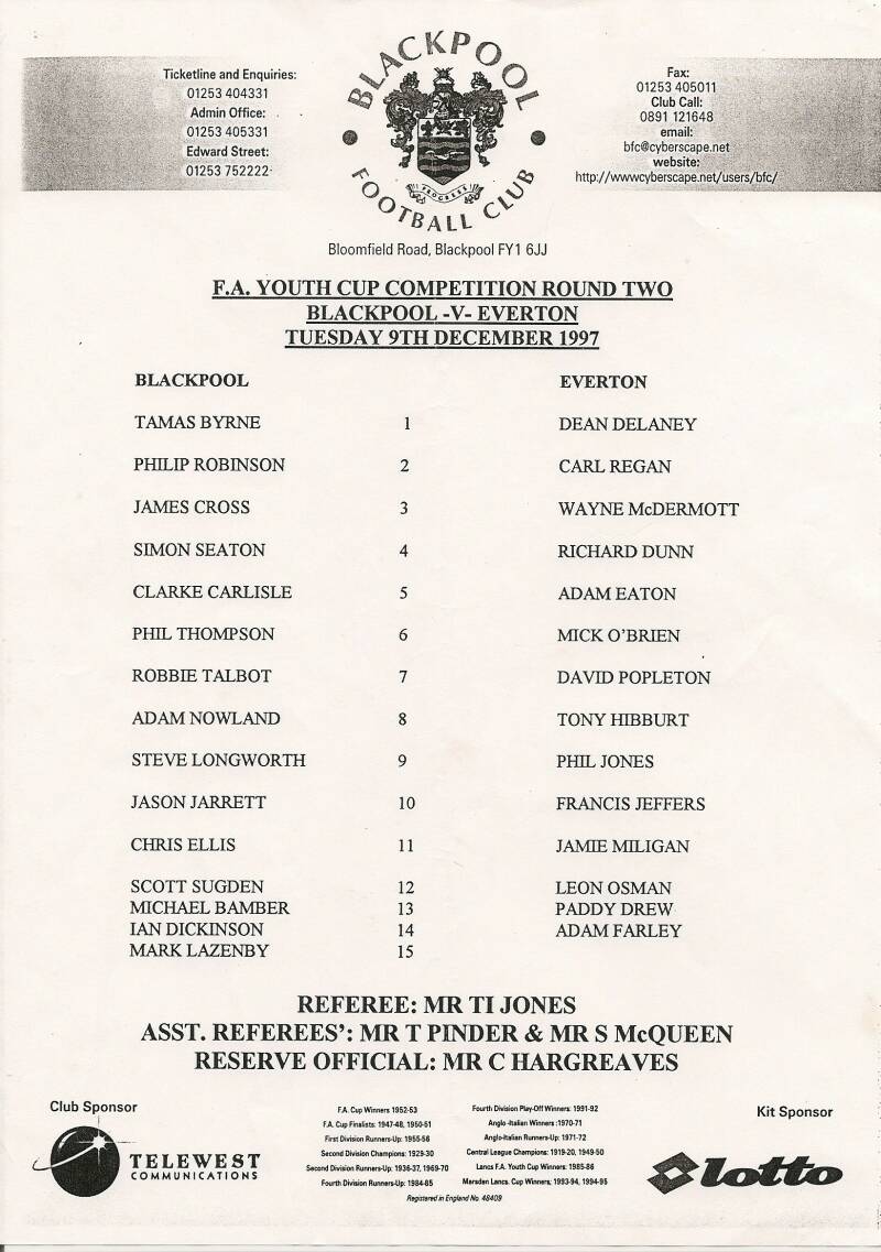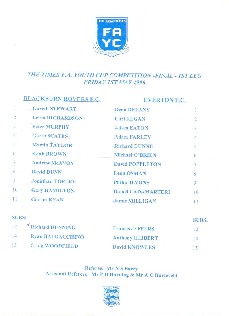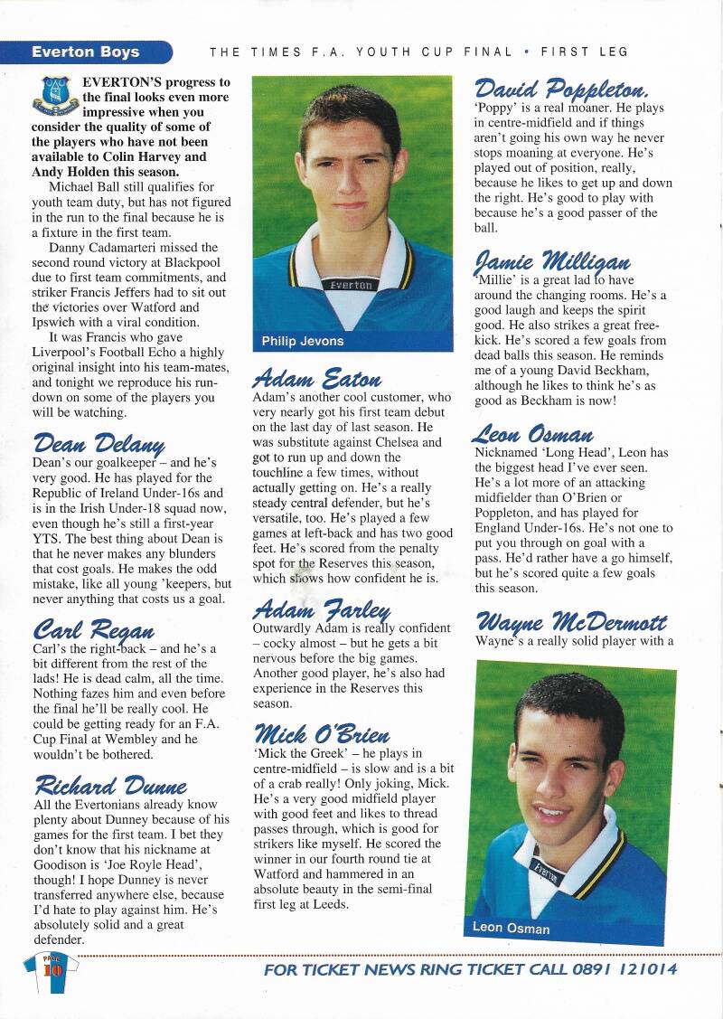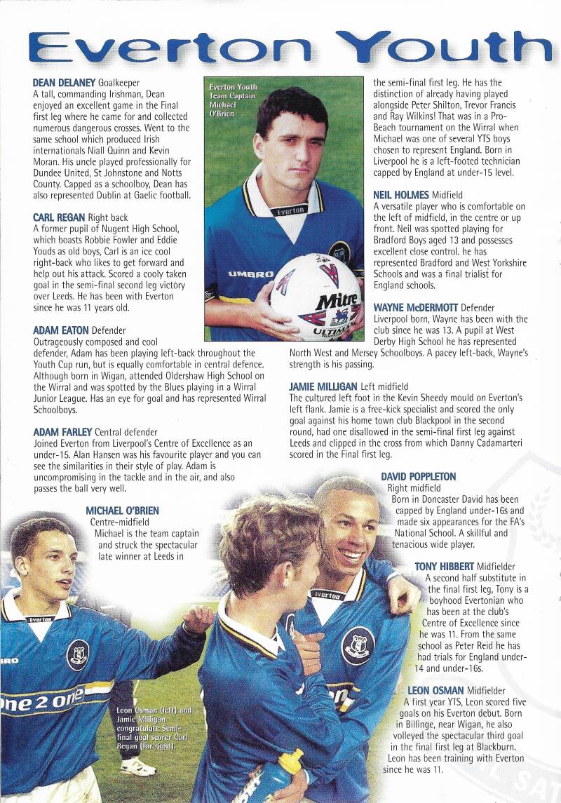 EVERTON Youth (from): Delaney, Regan, Eaton, Farley, Dunne, O’Brien, Poppleton, Osman, Jevons, Cadamarteri, Milligan, Jeffers, McLeod, Howarth, Knowles, Hibbert.