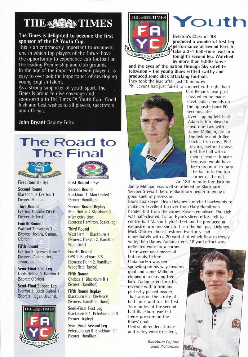 | 7 May 98 | Home - Goodison Park | Blackburn Rovers | Final 2nd Leg | 2-2 | Jeffers F, Eaton A | 15,258 |