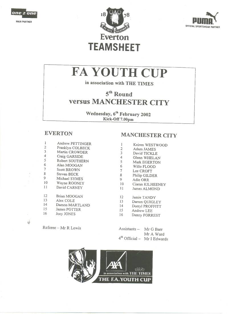 | 6 Feb 02 | Home - Goodison Park | Manchester City | 5th Round | 4-2 | Rooney W 2, Own Goal, Beck S | 1,080 |