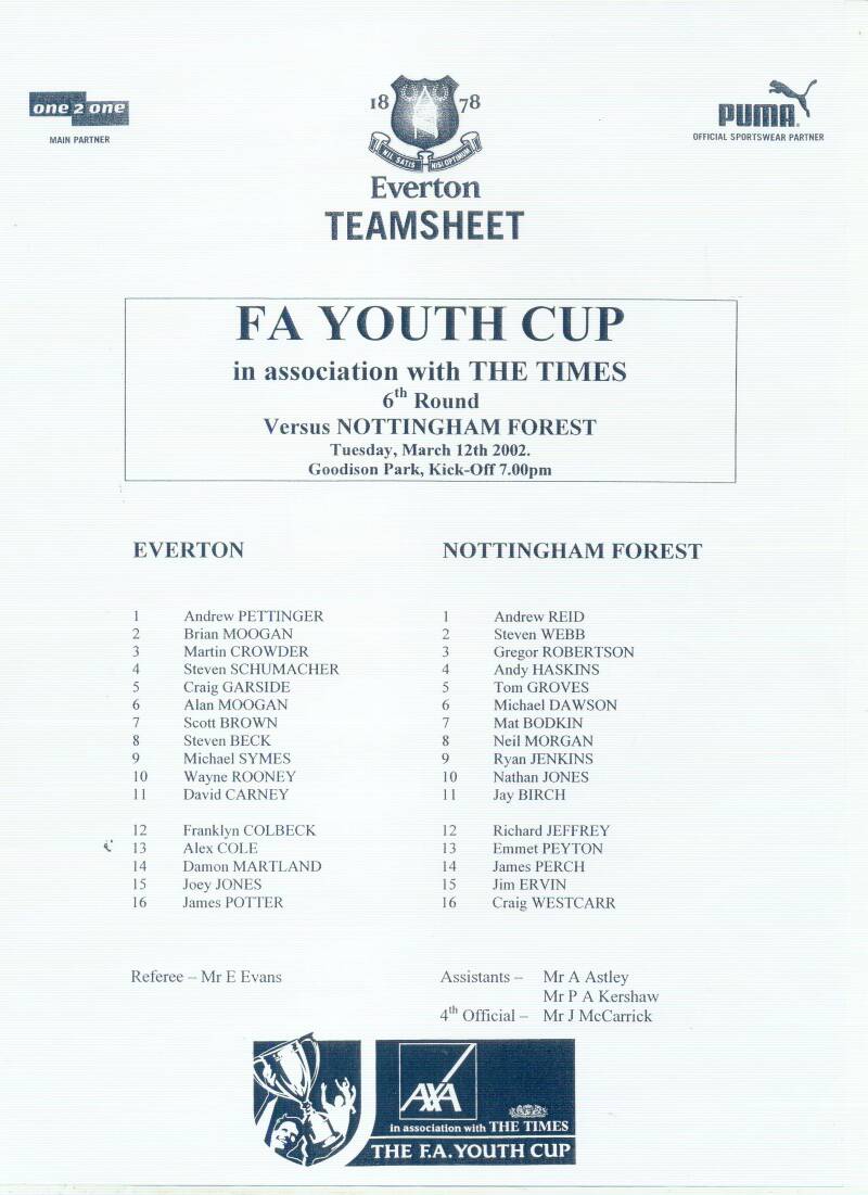| 12 Mar 02 | Home - Goodison Park | Nottingham Forest | 6th Round | 2-1 | Rooney W, Carney D | 1,420 |