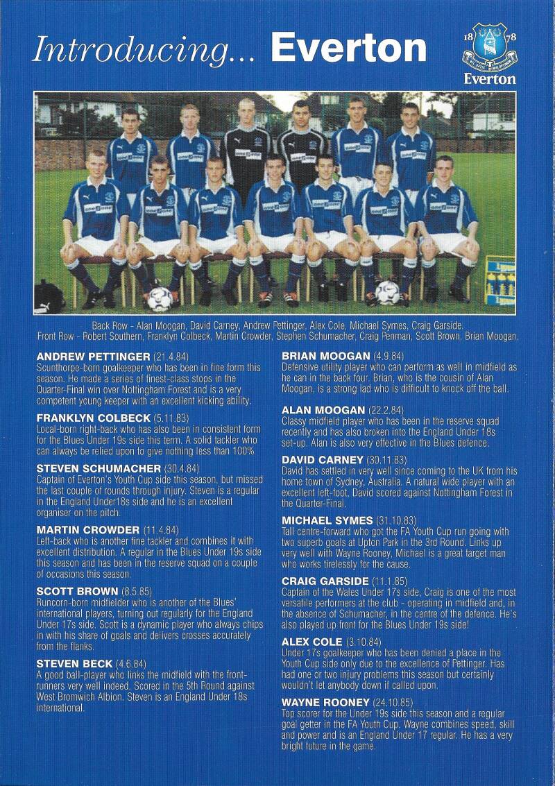 Everton: Pettinger, B Moogan, Crowder, Schumacher {c}, Garside, A Moogan, Brown, Beck, Symes, Rooney, Carney.